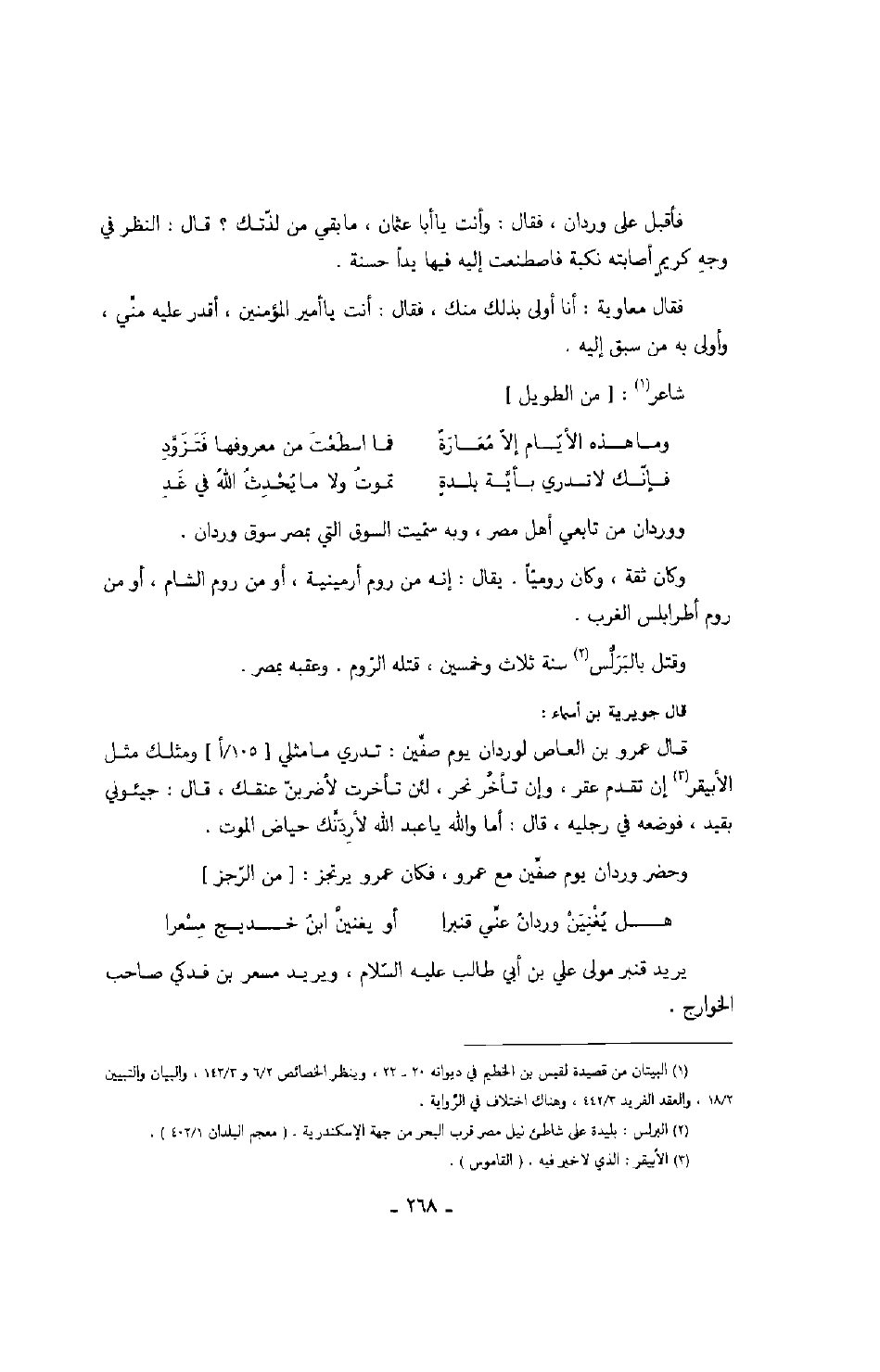 قال جويرية بن أسماء: قال عمرو بن العاص لوردان يوم صفين: تدري ما مثلي ومثلك مثل الأبيقر إن تقدم عقر، وإن تأخر نحر، لئن تأخرت لأضربن عنقك، قال: جيئوني بقيد، فوضعه في رجليه، قال: أما والله يا عبد الله لأردنك حياض الموت.