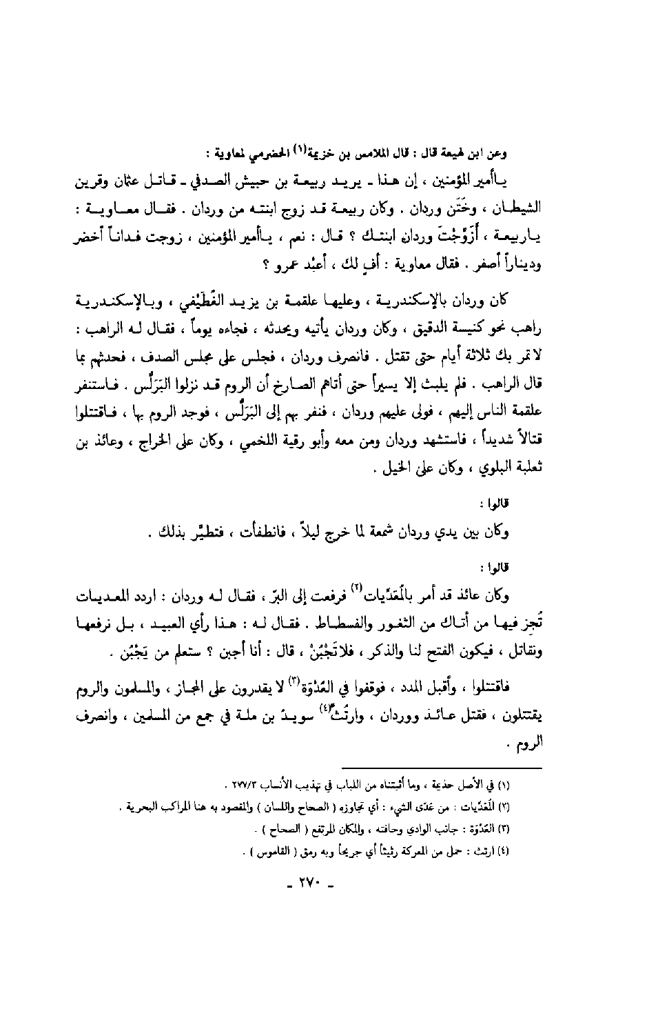 فاقتتلوا، وأقبل المدد، فوقفوا في العدوة لا يقدرون على المجاز، والمسلمون والروم يقتتلون، فقتل عائذ ووردان، وارتث سويد بن ملة في جمع من المسلمين، وانصرف الروم.