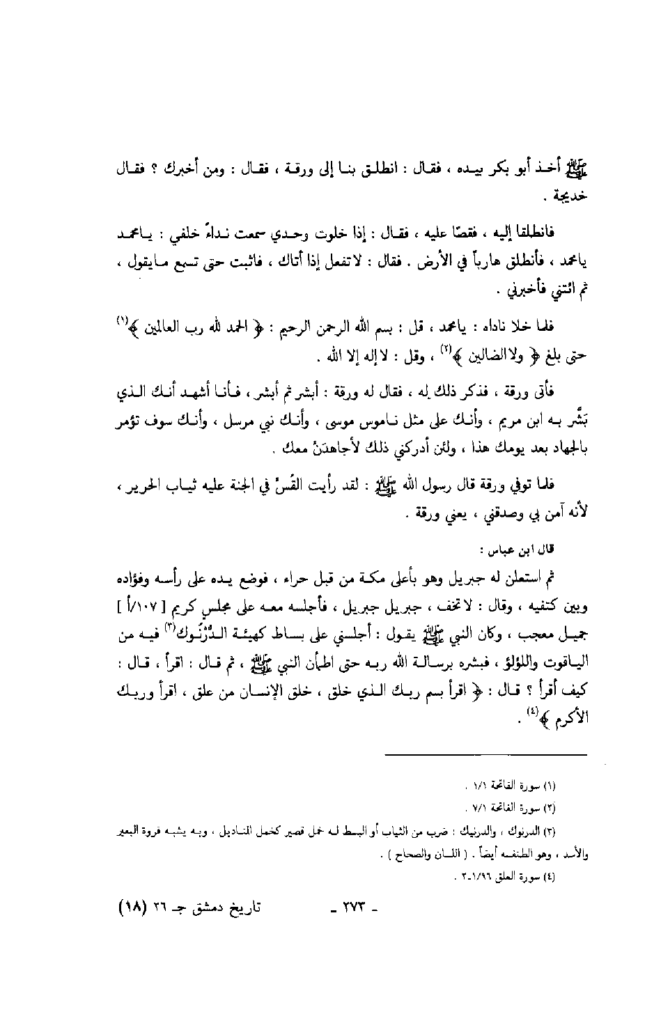 قال ابن عباس: ثم استعلن له جبريل وهو بأعلى مكة من قبل حراء، فوضع يده على رأسه وفؤاده وبين كتفيه، وقال: لا تخف، جبريل جبريل، فأجلسه معه على مجلس كريم جميل معجب، وكان النبي صَلَّى اللهُ عَلَيْهِ وَسَلَّمَ يقول: أجلسني على بساط كهيئة الدرنوك فيه من الياقوت واللؤلؤ، فبشره برسالة الله ربه حتى اطمأن النبي صَلَّى اللهُ عَلَيْهِ وَسَلَّمَ، ثم قال: اقرأ، قال: كيف أقرأ؟ قال: " اقرأ بسم ربك الذي خلق، خلق الإنسان من علق، اقرأ وربك الأكرم ".