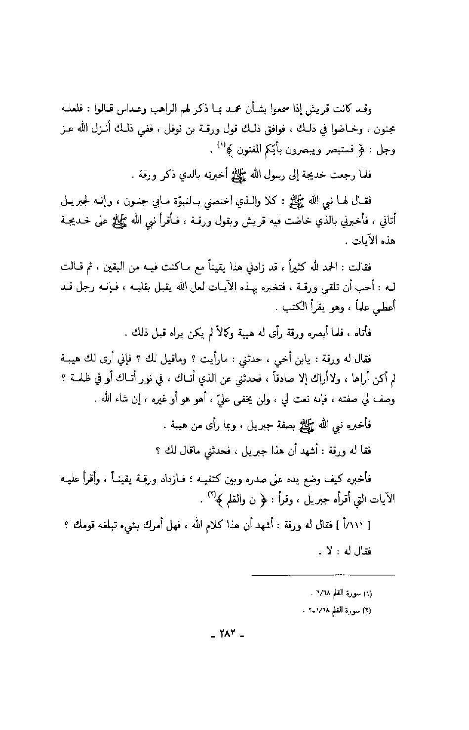 فقال له ورقة: أشهد أن هذا جبريل، فحدثني ما قال لك؟ فأخبره كيف وضع يده على صدره وبين كتفيه؛ فازداد ورقة يقيناً، وأقرأ عليه الآيات التي أقرأه جبريل، وقرأ: " ن والقلم ".