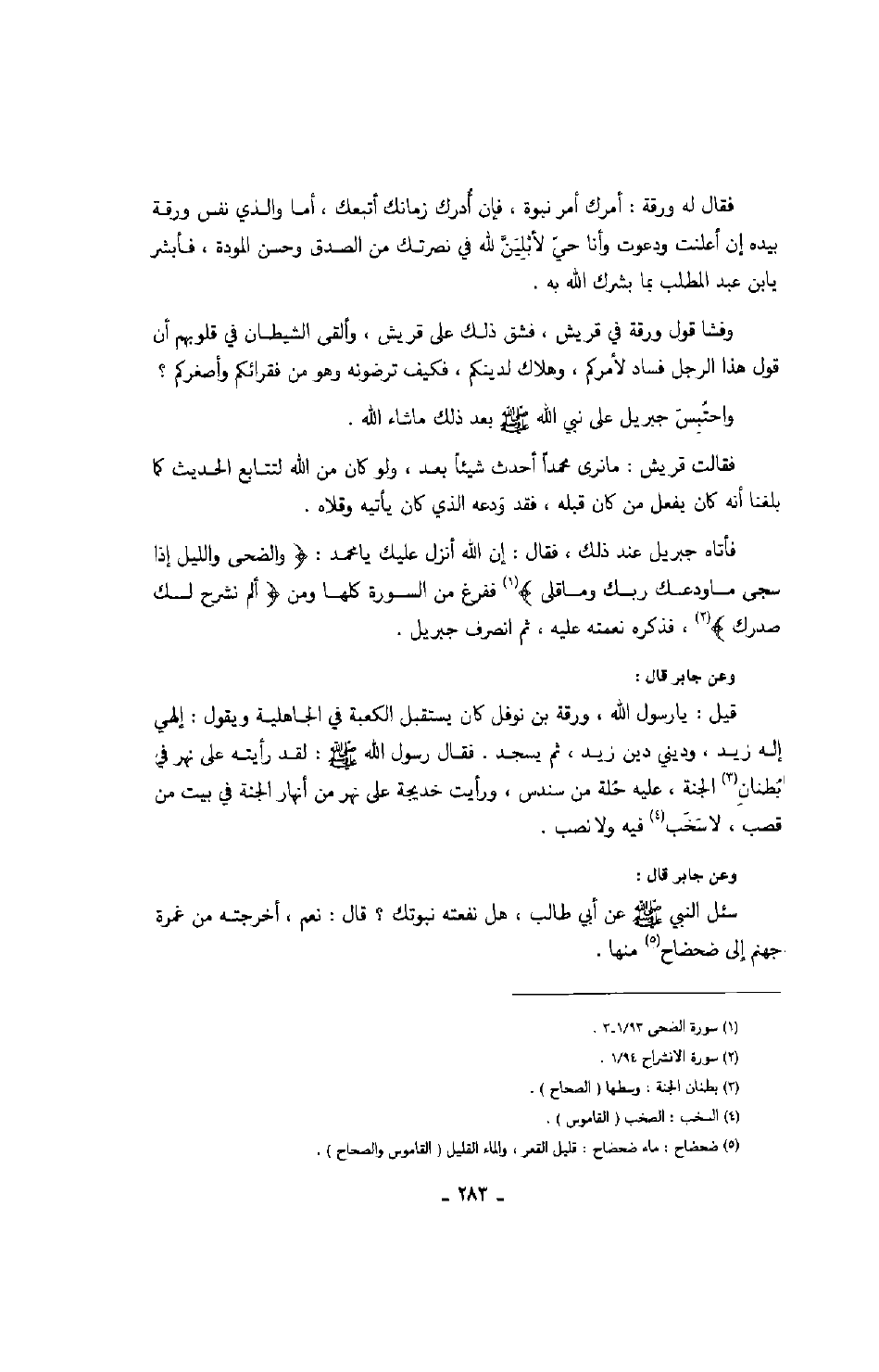 وعن جابر قال: قيل: يا رسول الله، ورقة بن نوفل كان يستقبل الكعبة في الجاهلية ويقول: إلهي إله زيد، وديني دين زيد، ثم يسجد. فقال رسول الله صَلَّى اللهُ عَلَيْهِ وَسَلَّمَ: لقد رأيته على نهر في بطنان الجنة، عليه حلة من سندس، ورأيت خديجة على نهر من أنهار الجنة في بيت من قصب، لاسخب فيه ولانصب.
