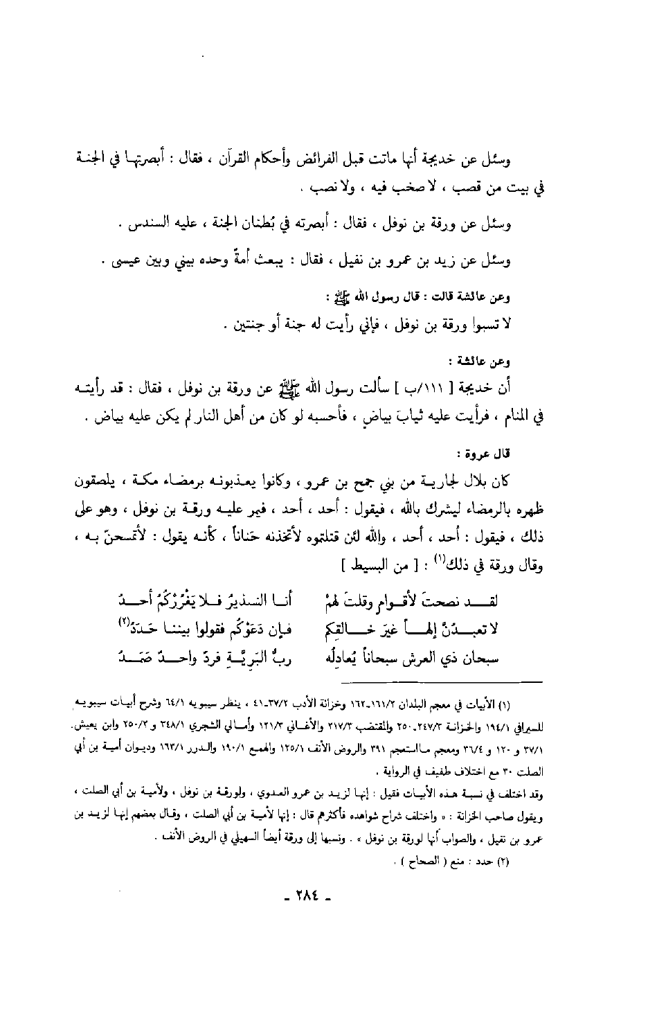 قال عروة: كان بلال لجارية من بني جمح بن عمرو، وكانوا يعذبونه برمضاء مكة، يلصقون ظهره بالرمضاء ليشرك بالله، فيقول: أحد، أحد، فيمر عليه ورقة بن نوفل، وهو على ذلك، فيقول: أحد، أحد، والله لئن قتلتموه لأتخذنه حناناً، كأنه يقول: لأتمسحن به، وقال ورقة في ذلك: من البسيط