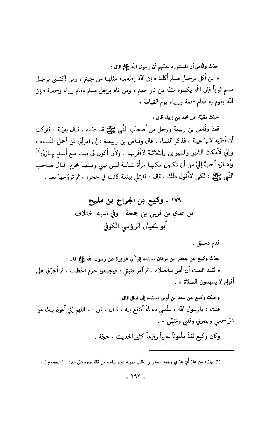 حدث وكيع عن جعفر بن برقان بسنده إلى أبي هريرة عن رسول الله صَلَّى اللهُ عَلَيْهِ وَسَلَّمَ قال: " لقد هممت أن آمر بالصلاة، ثم آمر فتيتي، فيجمعوا حزم الحطب، ثم أحرق على أقوام لا يشهدون الصلاة ".