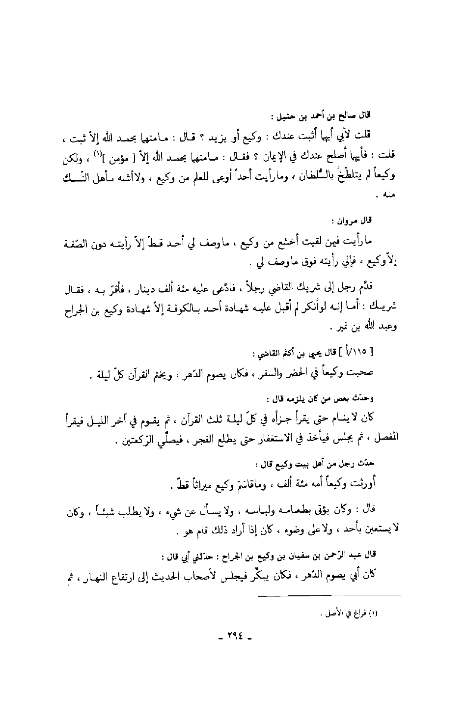 قال صالح بن أحمد بن حنبل: قلت لأبي أيهما أثبت عندك: وكيع أو يزيد؟ قال: ما منهما بحمد الله إلا ثبت، قلت: فأيهما أصلح عندك في الإيمان؟ فقال: ما منهما بحمد الله إلا مؤمن، ولكن وكيعاً لم يتلطخ بالسلطان، وما رأيت أحداً أوعى للعلم من وكيع، ولا أشبه بأهل النسك منه.