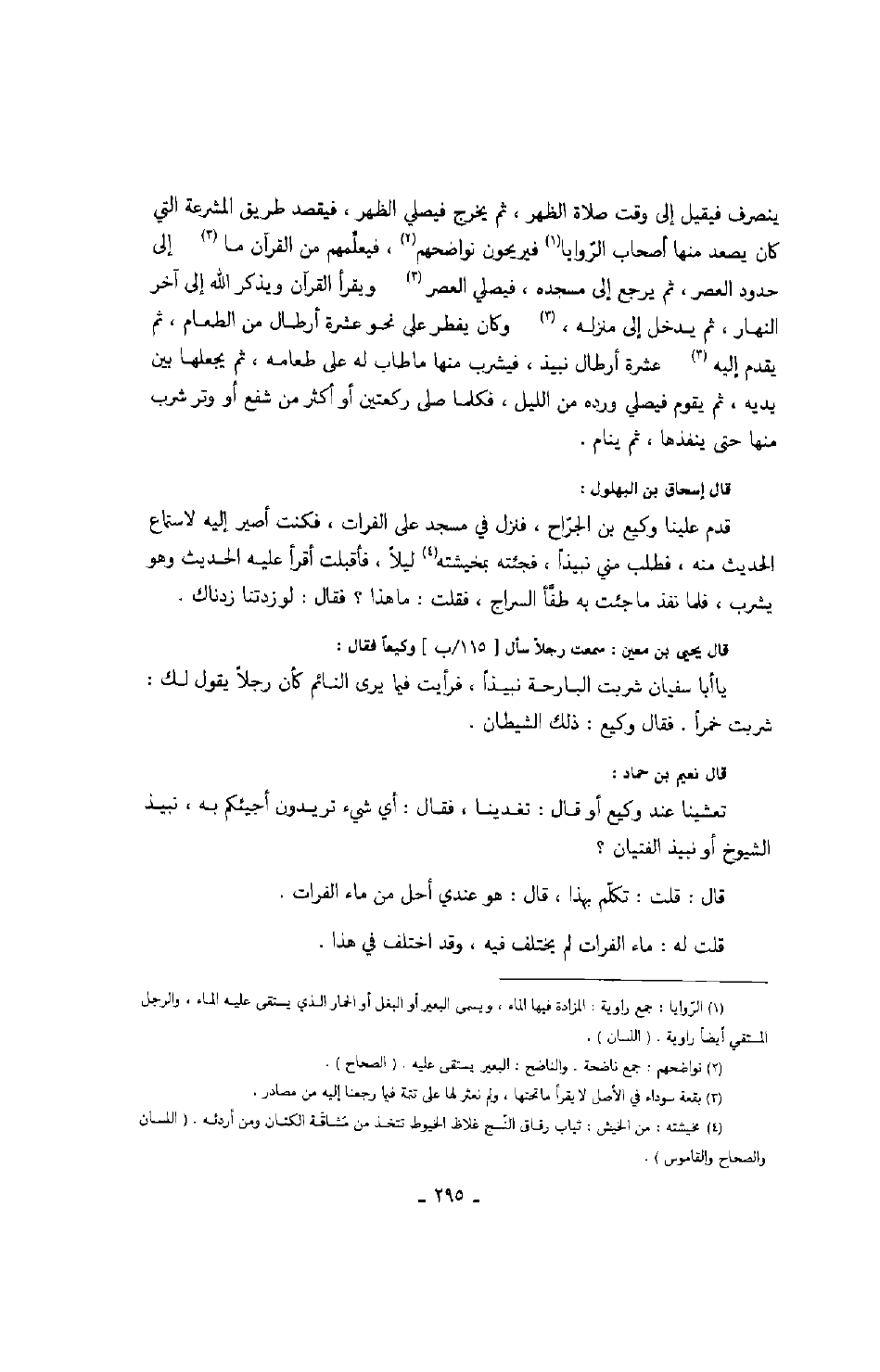 قال نعيم بن حماد: تعشينا عند وكيع أو قال: تغذينا، فقال: أي شيء تريدون أجيئكم به، نبيذ الشيوخ أو نبيذ الفتيان؟ قال: قلت: تكلم بهذا، قال: هو عندي أحل من ماء الفرات.