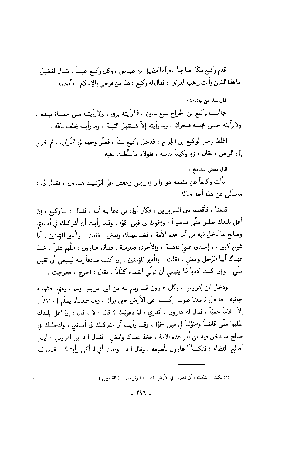قال بعض المشايخ: سألت وكيعاً عن مقدمه هو وابن إدريس وحفص على الرشيد هارون، فقال لي: ما سألني عن هذا أحد قبلك: قدمنا، فأقعدنا بين السريرين، فكان أول من دعا به أنا، فقال: يا وكيع، إن أهل بلدك طلبوا مني قاضياً، وسموك لي فيمن سموا، وقد رأيت أن أشركك في أمانتي وصالح ما أدخل فيه من أمر هذه الأمة، فخذ عهدك وامض. فقلت: يا أمير المؤمنين، أنا شيخ كبير، وإحدى عيني ذاهبة، والأخرى ضعيفة. فقال هارون: اللهم غفراً، خذ عهدك أيها الرجل وامض. فقلت: يا أمير المؤمنين، إن كنت صادقاً إنه لينبغي أن تقبل مني، وإن كنت كاذباً فما ينبغي أن تولي القضاء كذاباً. فقال: اخرج، فخرجت.