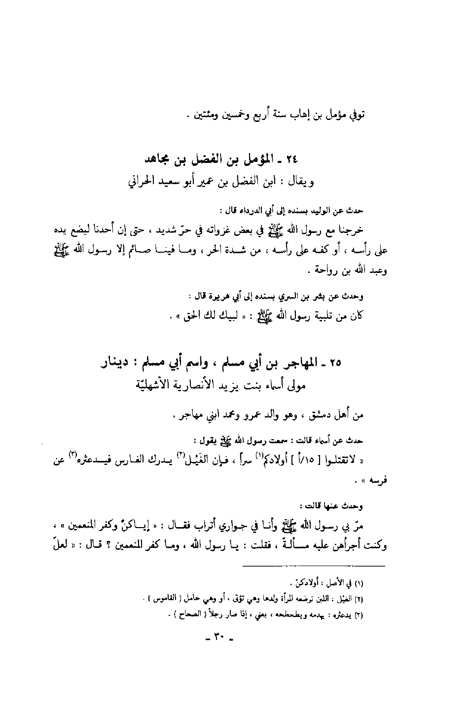 حدث عن أسماء قالت: سمعت رسول الله صَلَّى اللهُ عَلَيْهِ وَسَلَّمَ يقول: " لا تقتلوا أولادكم سراً، فإن الغيل يدرك الفارس فيدعثره عن فرسه ".