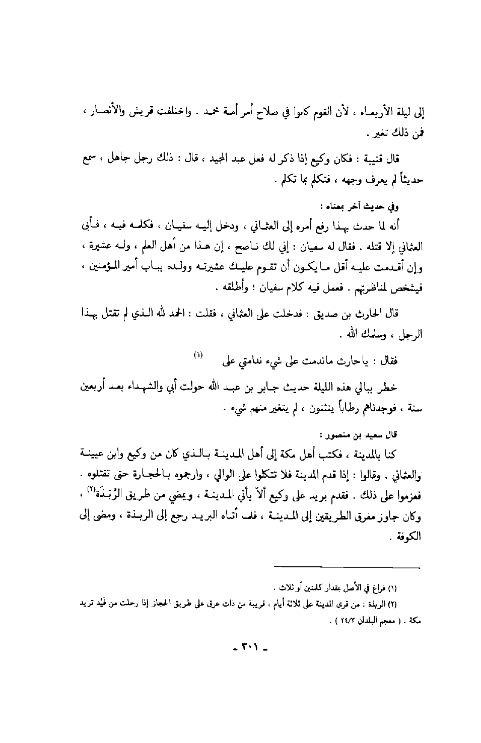 قال سعيد بن منصور: كنا بالمدينة، فكتب أهل مكة إلى أهل المدينة بالذي كان من وكيع وابن عيينة والعثماني. وقالوا: إذا قدم المدينة فلا تتكلوا على الوالي، وأرجموه بالحجارة حتى تقتلوه. فعزموا على ذلك. فقدم بريد على وكيع ألا يأتي المدينة، ويمضي من طريق الربذة. وكان جاوز مفرق الطريقين إلى المدينة، فلما أتاه البريد رجع إلى الربذة، ومضى إلى الكوفة.
