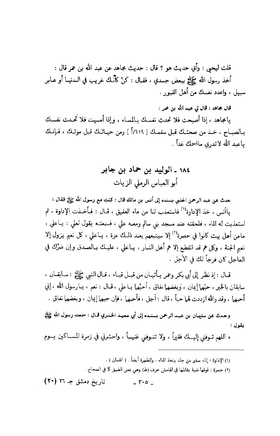 قلت ليحيى: وأي حديث هو؟ قال: حديث مجاهد عن عبد الله بن عمر قال: أخذ رسول الله صَلَّى اللهُ عَلَيْهِ وَسَلَّمَ ببعض جسدي، فقال: كن كأنك غريب في الدنيا أو عابر سبيل، واعدد نفسك من أهل القبور.