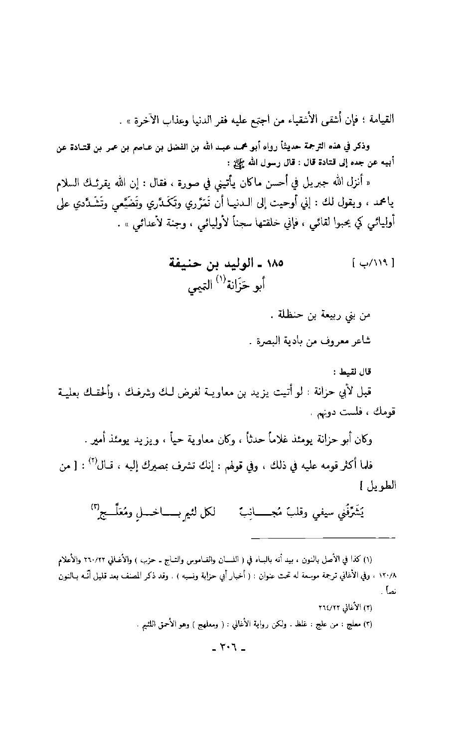وكان أبو حزانة يومئذ غلاماً حدثاً، وكان معاوية حياً، ويزيد يومئذ أمير. فلما أكثر قومه عليه في ذلك، وفي قولهم: إنك تشرف بمصيرك إليه، قال: " من الطويل "