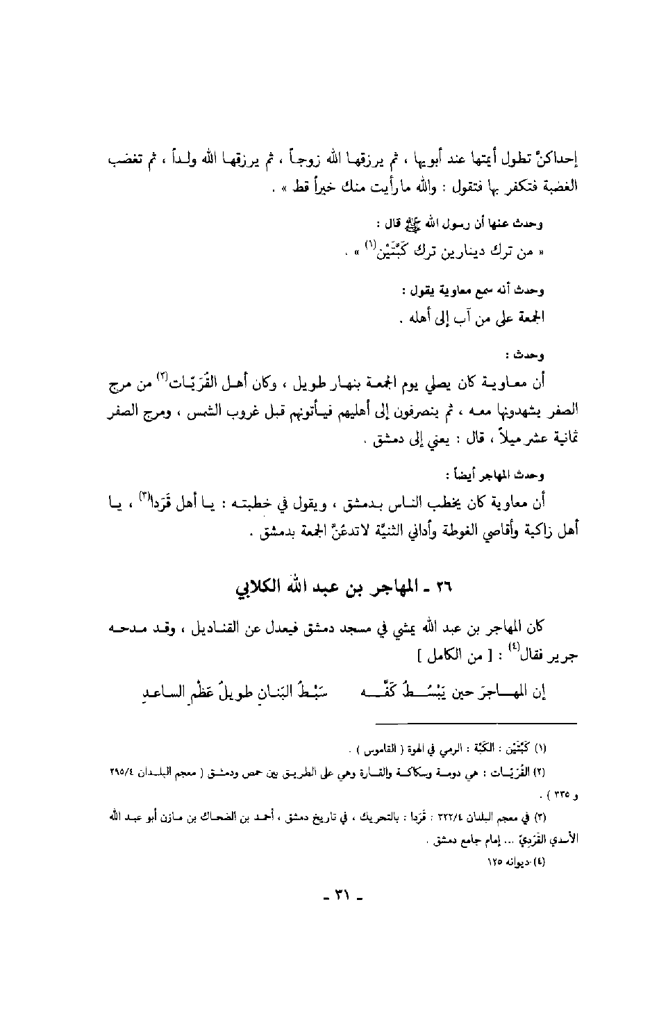 كان المهاجر بن عبد الله يمشي في مسجد دمشق فيعدل عن القناديل، وقد مدحه جرير فقال: " من الكامل "