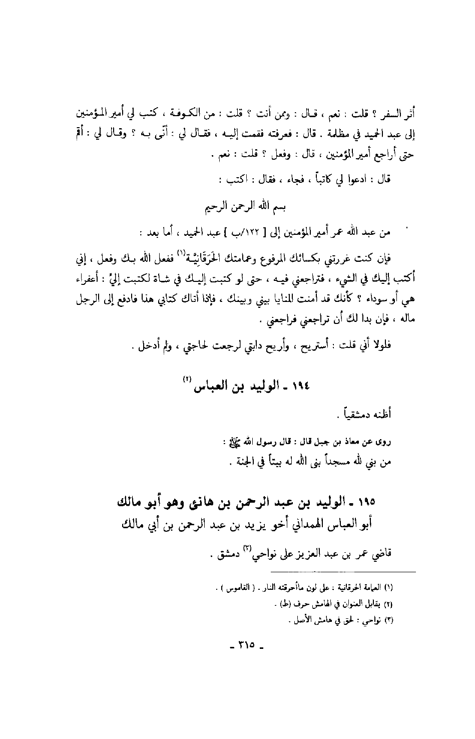أثر السفر؟ قلت: نعم، قال: وممن أنت؟ قلت: من الكوفة، كتب لي أمير المؤمنين إلى عبد الحميد في مظلمة. قال: فعرفته فقمت إليه، فقال لي: أنى به؟ وقال لي: أقم حتى أراجع أمير المؤمنين، قال: وفعل؟ قلت: نعم.