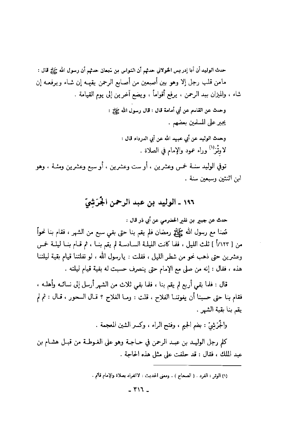 حدث الوليد أن أبا إدريس الخولاني حدثهم أن النواس بن سمعان حدثهم أن رسول الله صَلَّى اللهُ عَلَيْهِ وَسَلَّمَ قال: ما من قلب رجل إلا وهو بين أصبعين من أصابع الرحمن يقيمه إن شاء ويرفعه إن شاء، والميزان بيد الرحمن، يرفع أقواماً، ويضع آخرين إلى يوم القيامة.