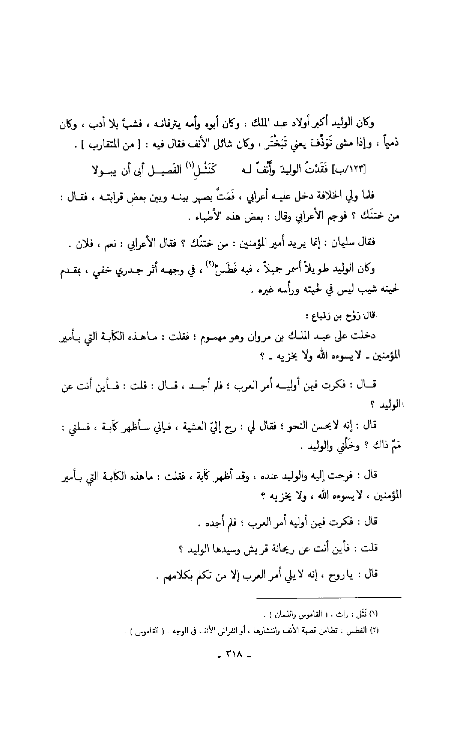 فلما ولي الخلافة دخل عليه أعرابي، فمت بصهر بينه وبين بعض قرابته، فقال: من حتنك؟ فوجم الأعرابي وقال: بعض هذه الأطباء.