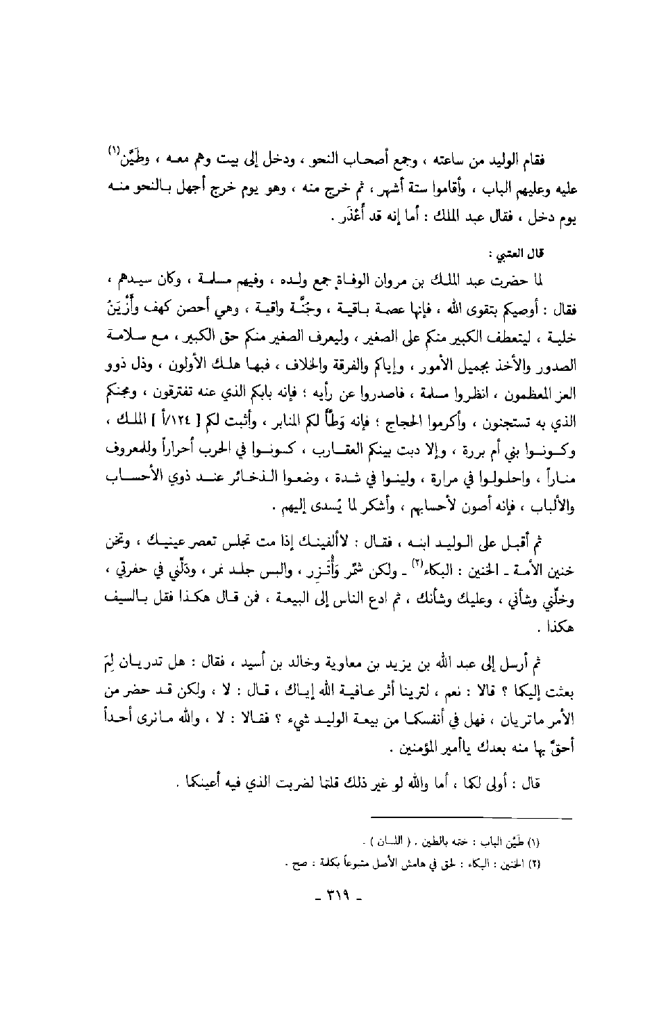 ثم أرسل إلى عبد الله بن يزيد بن معاوية وخالد بن أسيد، فقال: هل تدريان لم بعثت إليكما؟ قالا: نعم، لترينا أثر عافية الله إياك، قال: لا، ولكن قد حضر من الأمر ما تريان، فهل في أنفسكما من بيعة الوليد شيء؟ فقالا: لا، والله ما نرى أحداً أحق بها منه بعدك يا أمير المؤمنين.