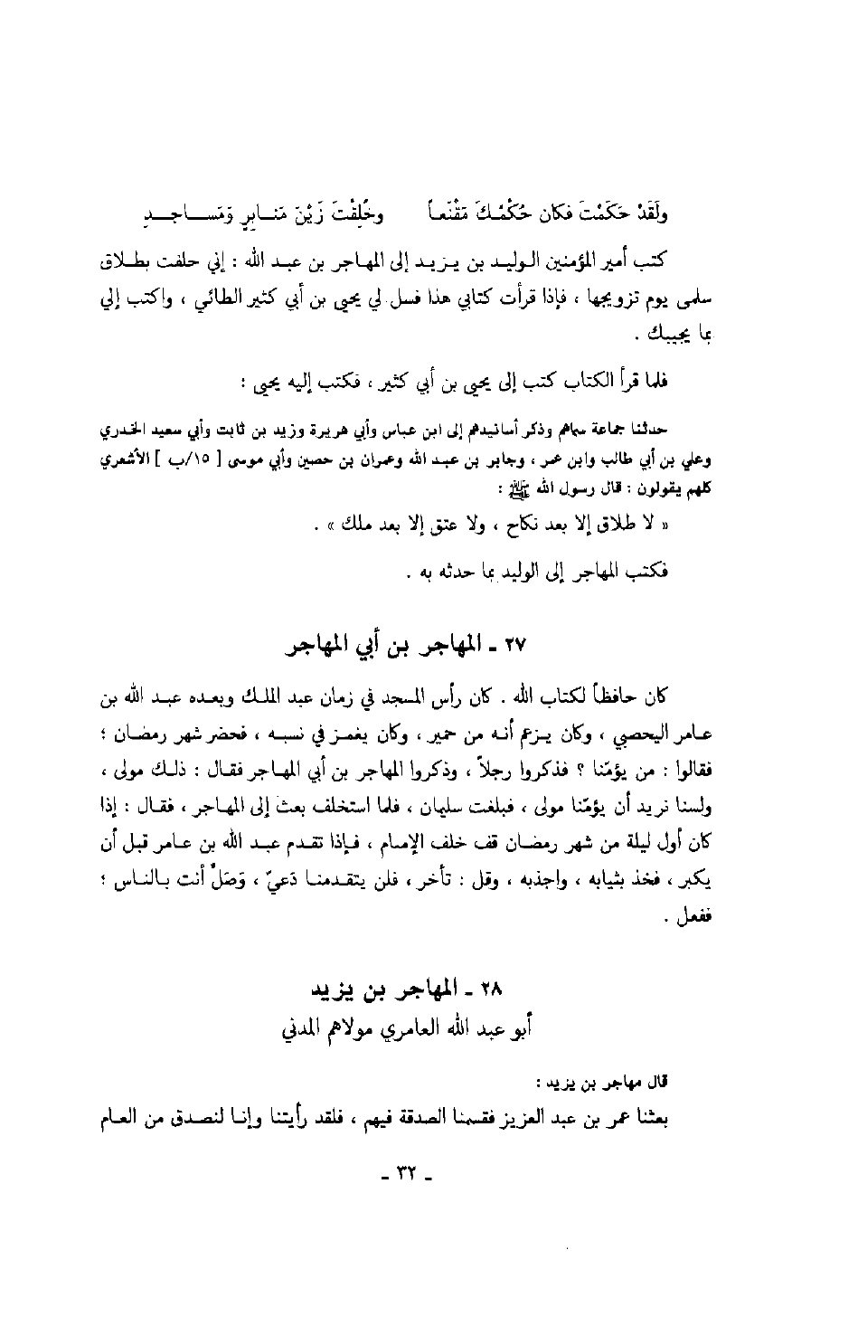 كتب أمير المؤمنين الوليد بن يزيد إلى المهاجر بن عبد الله: إني حلفت بطلاق سلمى يوم تزويجها، فإذا قرأت كتابي هذا فسل لي يحيى بن أبي كثير الطائي، واكتب إلي بما يجيبك.