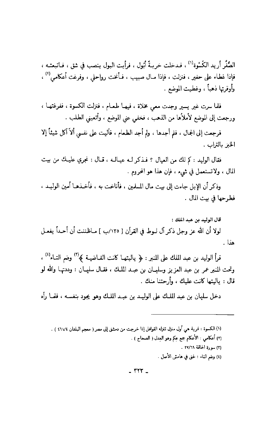 قرأ الوليد بن عبد الملك على المنبر: " يا ليتها كانت القاضية " وضم التاء، وتحت المنبر عمر بن عبد العزيز وسليمان بن عبد الملك، فقال سليمان: وددتها والله لو قال: يا ليتها كانت عليك، وأرحتنا منك.