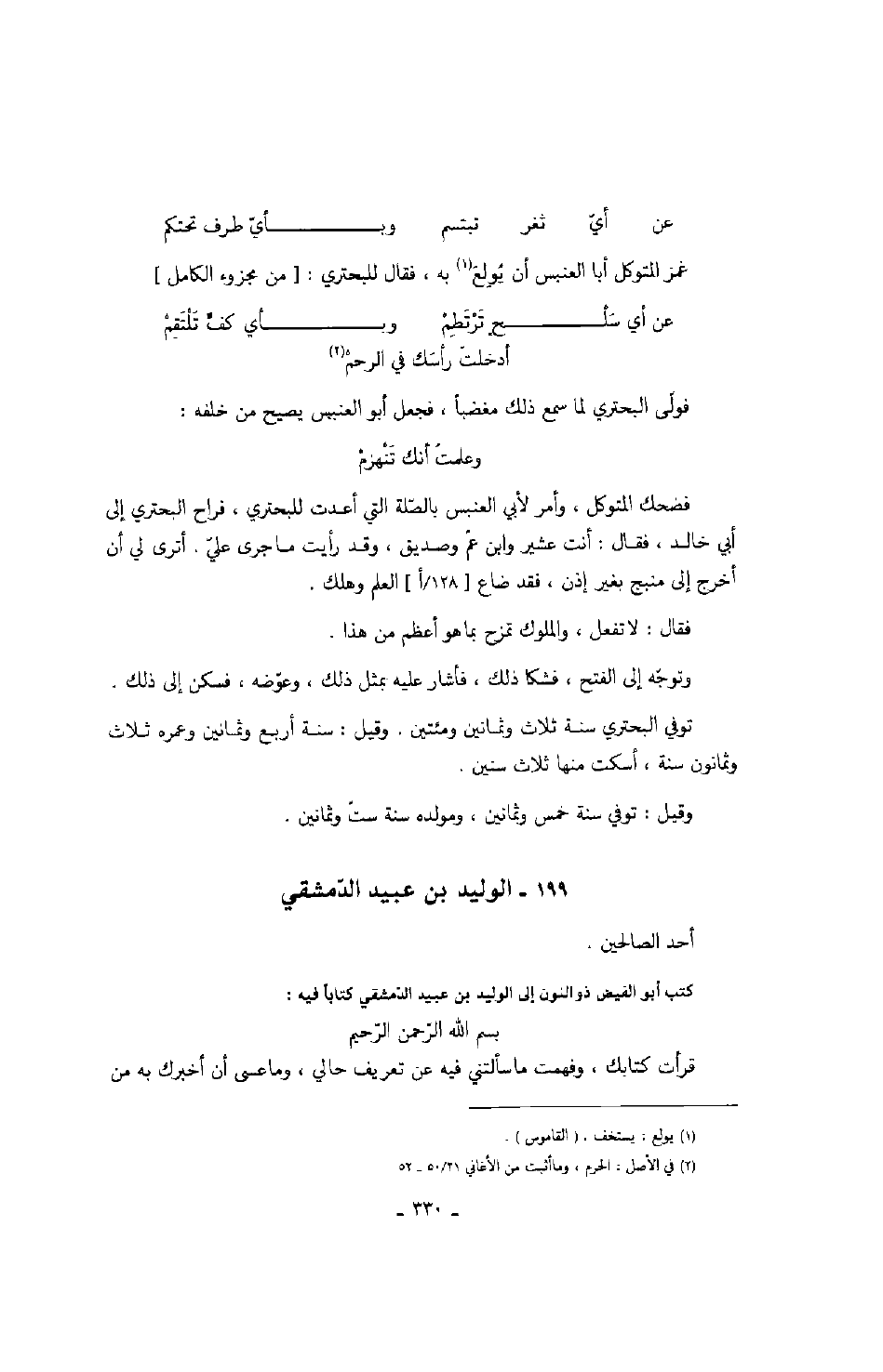 وتوجه إلى الفتح، فشكا ذلك، فأشار عليه بمثل ذلك، وعوضه، فسكن إلى ذلك، توفي البحتري سنة ثلاث وثمانين ومئتين. وقيل: سنة أربع وثمانين وعمره ثلاث وثمانون سنة، أسكت منها ثلاث سنين.
