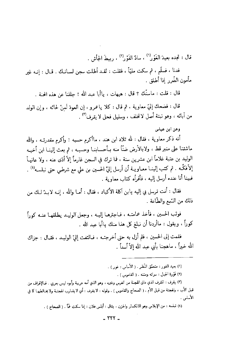 وعن ابن عباس أنه ذكر معاوية، فقال: لله تلاد ابن هند، ما أكرم حسبه! وأكرم مقدرته، والله ما شتمنا على منبر قط، ولا بالأرض ضناً منه بأحسابنا وحسبه، ثم بعث إلينا ابن أخيه الوليد بن عتبة غلاماً ابن عشرين سنة، فما ترك في السجن غارماً إلا أدى عنه، ولا عانياً إلا فكه. ثم كتب إلينا معاوية أن أرسل إلي الحسين بن علي مع شرطي حتى نبلسه. فبينا أنا عنده أرسل إليه، فأقرأه كتاب معاوية.