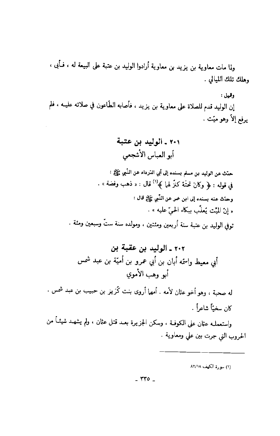حدث عن الوليد بن مسلم بسنده إلى أبي الدرداء عن النبي صَلَّى اللهُ عَلَيْهِ وَسَلَّمَ في قوله: " وكان تحته كنز لهما " قال: " ذهب وفضة " وحدث عنه بسنده إلى ابن عمر عن النبي صَلَّى اللهُ عَلَيْهِ وَسَلَّمَ قال: " إن الميت يعذب ببكاء الحي عليه ".