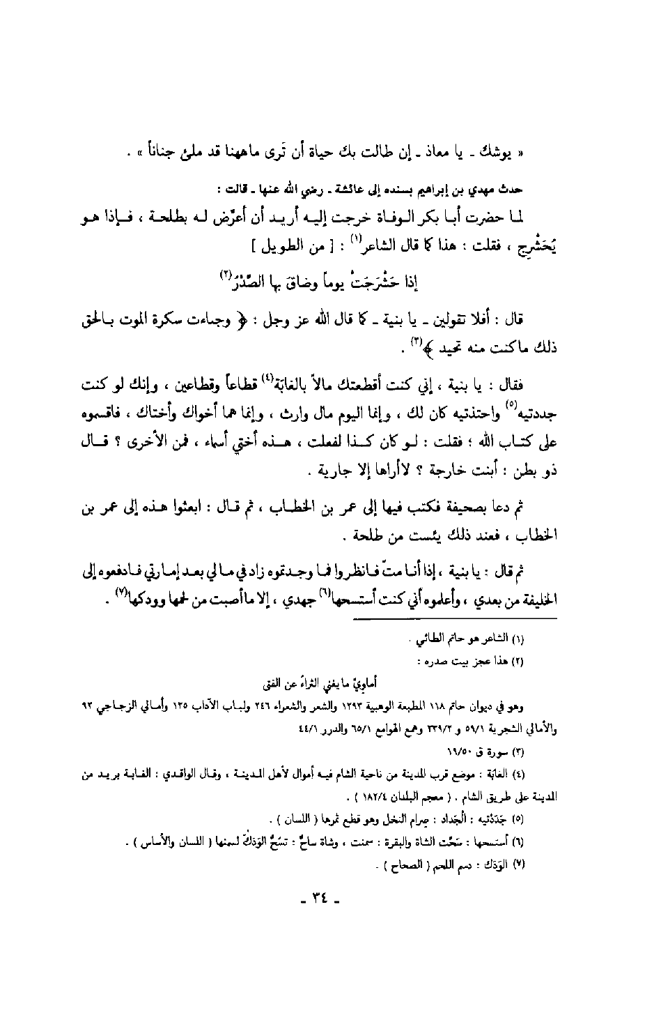 حدث معدي بن إبراهيم بسنده إلى عائشة - رضي الله عنها - قالت: لما حضرت أبا بكر الوفاة خرجت إليه أريد أن أعرض له بطلحة، فإذا هو يحشرج، فقلت: هذا كما قال الشاعر: " من الطويل "