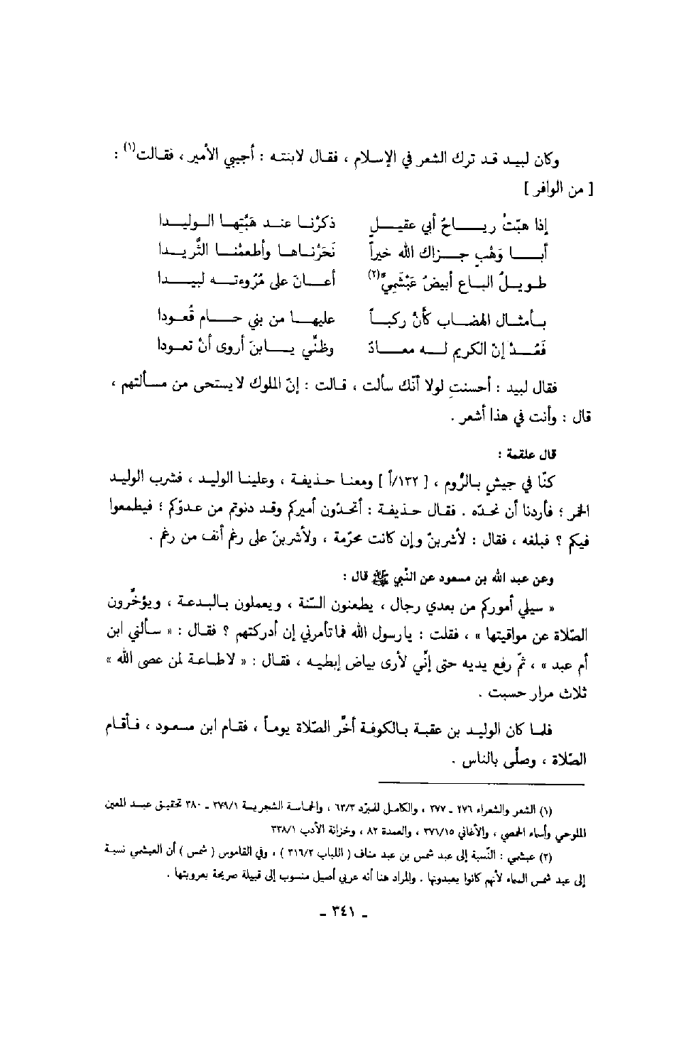 وكان لبيد قد ترك الشعر في الإسلام، فقال لابنته: أجيبي الأمير، فقالت: من الوافر