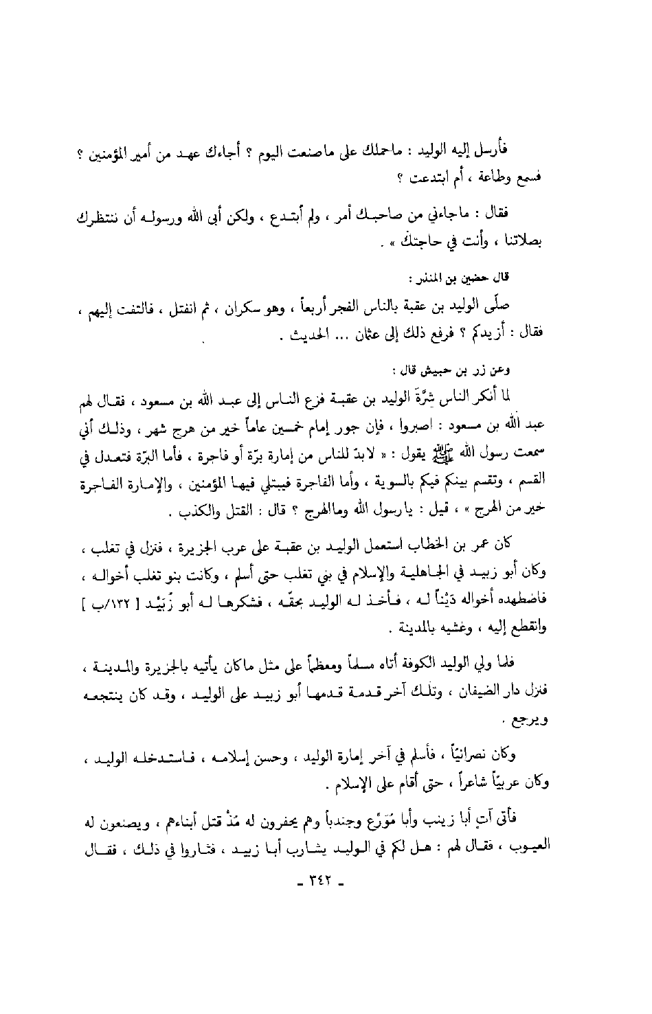 قال حضين بن المنذر: صلى الوليد بن عقبة بالناس الفجر أربعاً، وهو سكران، ثم انفتل، فالتفت إليهم، فقال: أزيدكم؟ فرفع ذلك إلى عثمان ... الحديث.