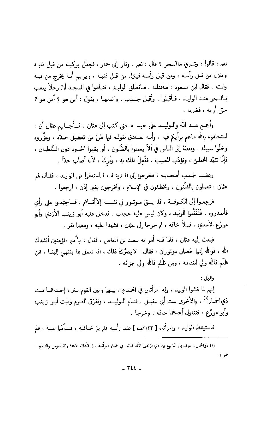 وأجمع عبد الله والوليد على حبسه حتى كتب إلى عثمان، فأجابهم عثمان أن: استحلفوه بالله ما علم برأيكم فيه، وأنه لصادق لقوله فيما ظن من تعطيل حده، وعزروه وخلوا سبيله. وتقدم إلى الناس في ألا يعملوا بالظنون، أو يقيموا الحدود دون السلطان، فإنا نقيد المخطئ، ونؤدب المصيب. ففعل ذلك به، وترك، لأنه أصاب حداً.