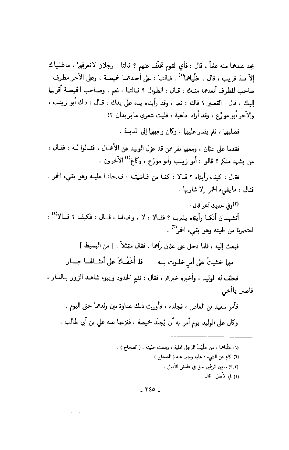 يجد عندهما منه علماً، قال: فأي القوم تخلف عنهم؟ قالتا: رجلان لا نعرفهما، ما غشياك إلا منذ قريب، قال: حلياهما. قالتا: على أحدهما خميصة، وعلى الآخر مطرف. صاحب المطرف أبعدهما منك، قال: الطوال؟ قالتا: نعم. وصاحب الخميصة أقربهما إليك، قال: القصير؟ قالتا: نعم، وقد رأيناه يده على يدك، قال: ذاك أبو زينب، والآخر أبو مورع، وقد أرادا داهية، فليت شعري ما يريدان؟ فطلبهما فلم يقدر عليهما وكان وجههما إلى المدينة فقدما على عثمان، ومعهما نفر ممن قد عزل الوليد عن الأعمال، فقالوا له: فقال: من يشهد منكم؟ قالوا: أبو زينب أبو مورع، وكاع الآخرون.