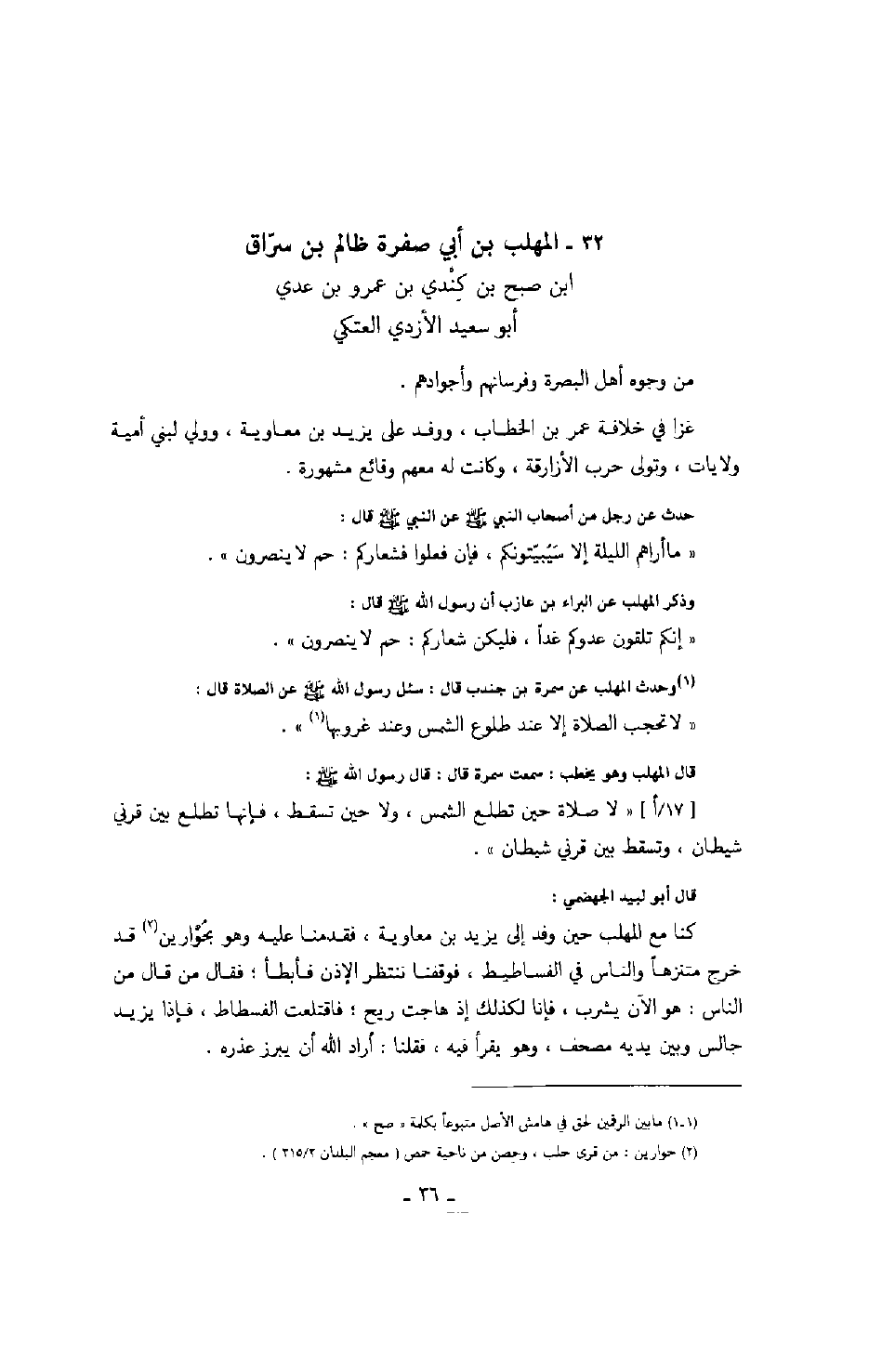 قال المهلب وهو يخطب: سمعت سمرة قال: قال رسول الله صَلَّى اللهُ عَلَيْهِ وَسَلَّمَ: " لا صلاة حين تطلع الشمس، ولا حين تسقط، فإنها تطلع بين قرني شيطان، وتسقط بين قرني شيطان ".