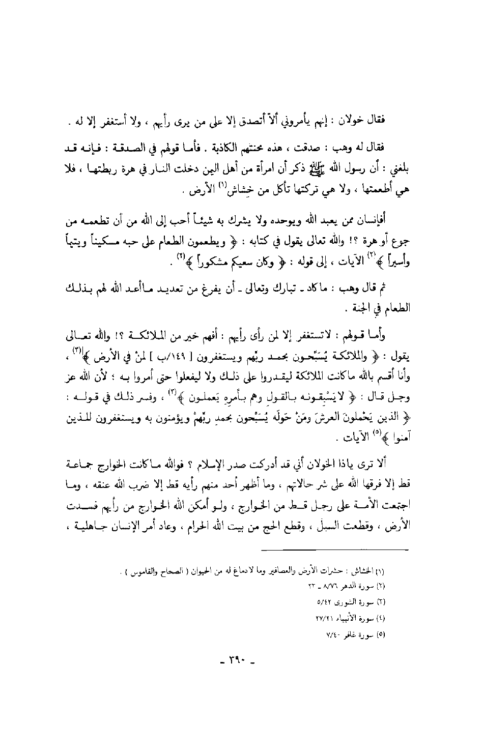 أفإنسان ممن يعبد الله ويوحده ولا يشرك به شيئاً أحب إلى الله من أن تطعمه من جوع أو هرة؟! والله تعالى يقول في كتابه: " ويطعمون الطعام على حبه مسكيناً ويتيماً وأسيراً " الآيات، إلى قوله: " وكان سعيكم مشكوراً ". ثم قال وهب ما كاد تبارك وتعالى أن يفرغ من تعديد ما أعد الله لهم بذلك الطعام في الجنة وأما قولهم: لا تستغفر إلا لمن رأى رأيهم: أفهم خير من الملائكة؟! والله تعالى يقول: " والملائكة يسبحون بحمد ربهم ويستغفرون لمن في الأرض "، وأنا أقسم بالله ما كانت الملائكة ليقدروا على ذلك ولا ليفعلوا حتى أمروا به؛ لأن الله عز وجل قال: " لا يسبقونه بالقول وهم بأمره يعملون "، وفسر ذلك في قوله: " الذين يحملون العرش ومن حوله يسبحون بحمد ربهم ويؤمنون به ويستغفرون للذين آمنوا " الآيات.
