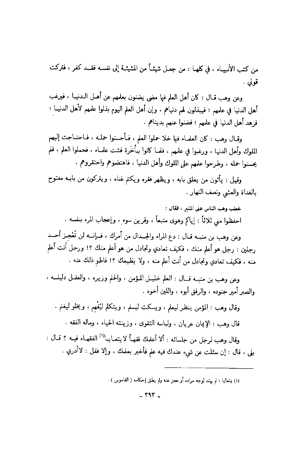وقال وهب لرجل من جلسائه: ألا أعلمك فقهاً لا يتعايا الفقهاء فيه؟ قال: بلى، قال: إن سئلت عن شيء عندك فيه علم فأخبر بعلمك، وإلا فقل: لا أدري.