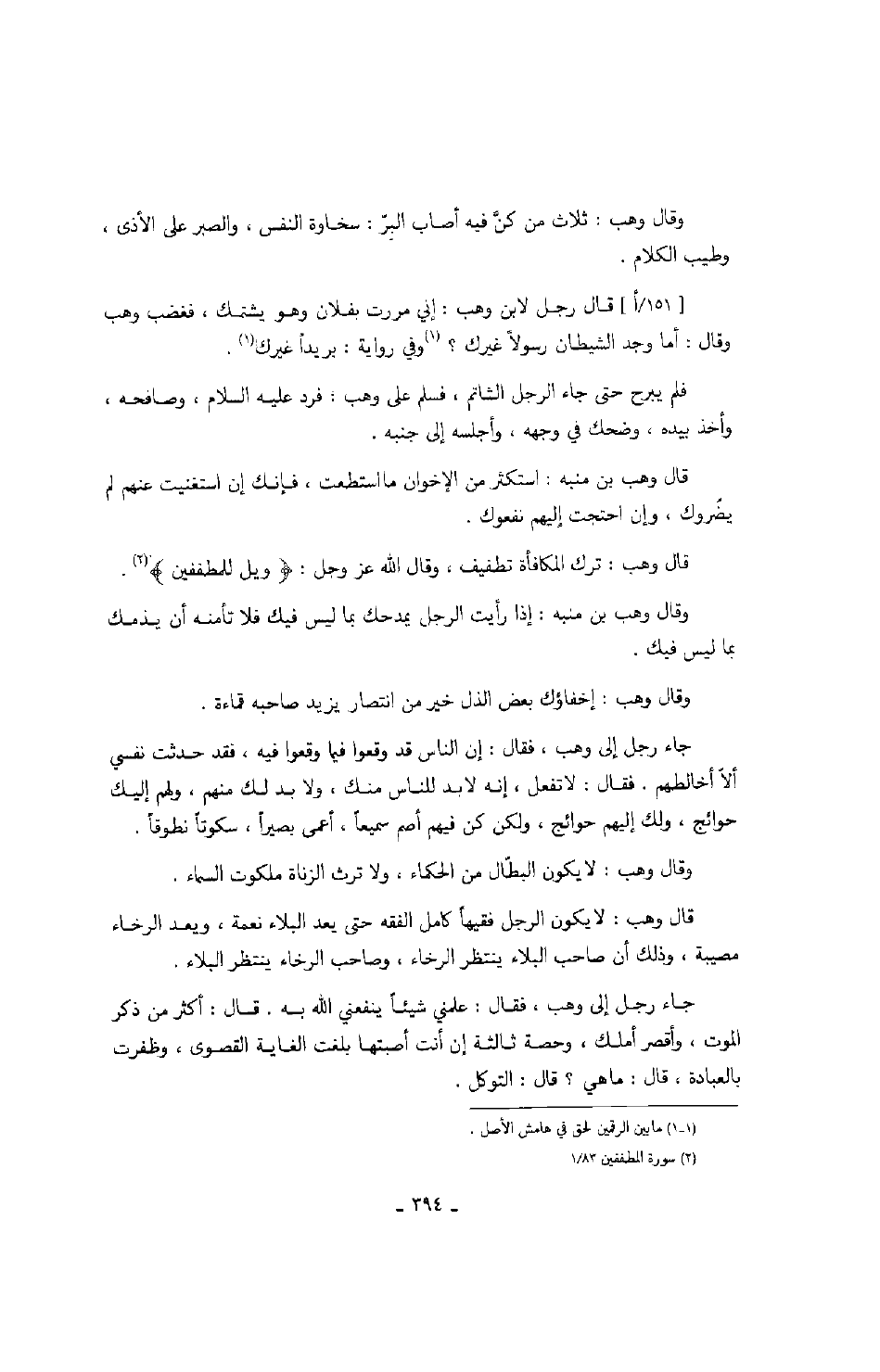 جاء رجل إلى وهب، فقال: علمني شيئاً ينفعني الله به. قال: أكثر من ذكر الموت، وأقصر أملك، وحصة ثالثة إن أنت أصبتها بلغت الغاية القصوى، وظفرت بالعبادة، قال: ما هي؟ قال: التوكل.