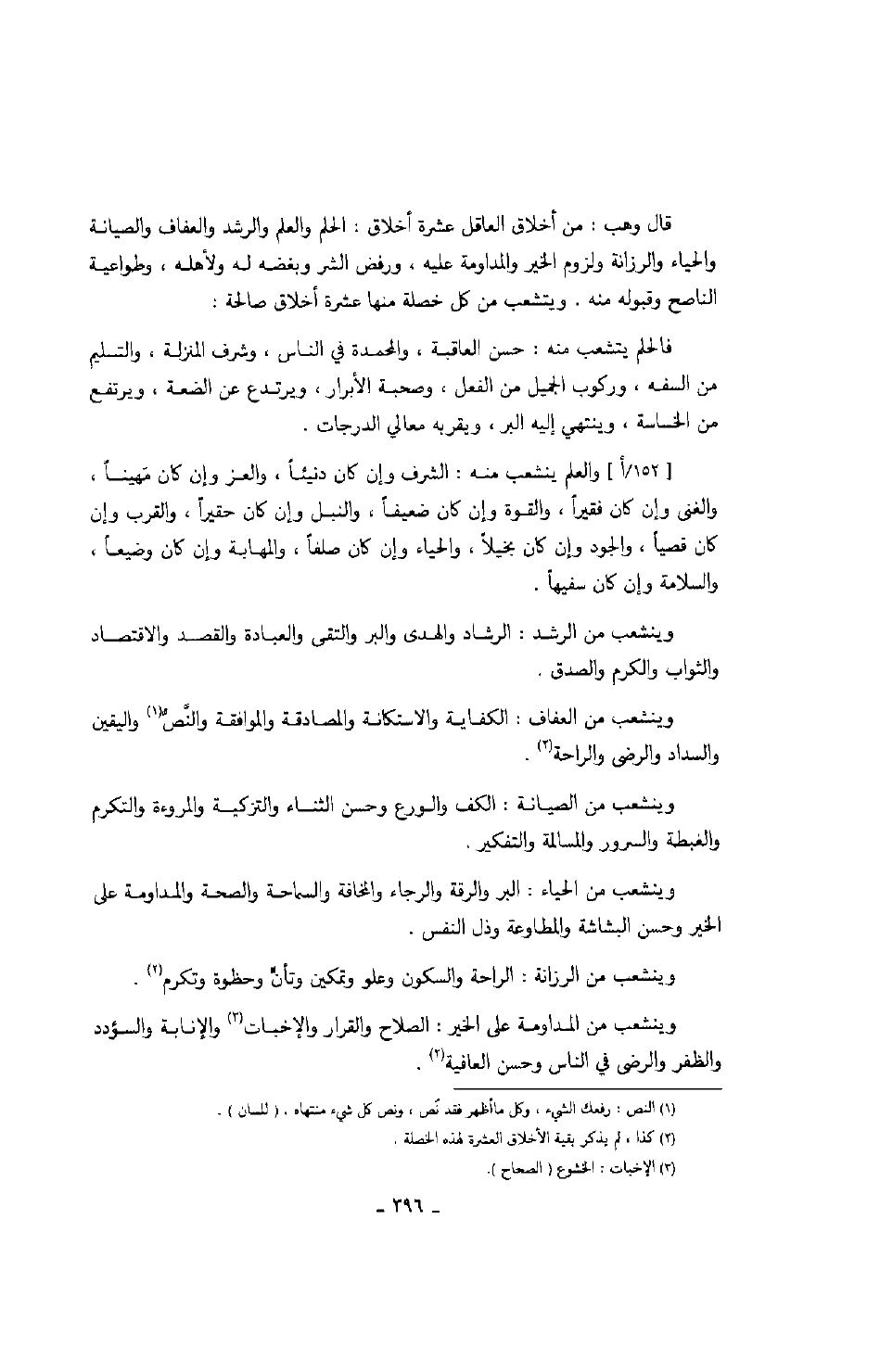 قال وهب: من أخلاق العاقل عشرة أخلاق: الحلم والعلم والرشد والعفاف والصيانة والحياء والرزانة ولزوم الخير والمداومة عليه، ورفض الشر وبغضه له ولأهله، وطواعية الناصح وقبوله منه. ويتشعب من كل خصلة منها عشرة أخلاق صالحة: فالحلم يتشعب منه: حسن العاقبة، والمحمدة في الناس، وشرف المنزلة، والتسليم من السفه، وركوب الجميل من الفعل، وصحبة الأبرار، ويرتدع عن الضعة، ويرتفع من الخساسة، وينتهي إليه البر، ويقربه معالي الدرجات.