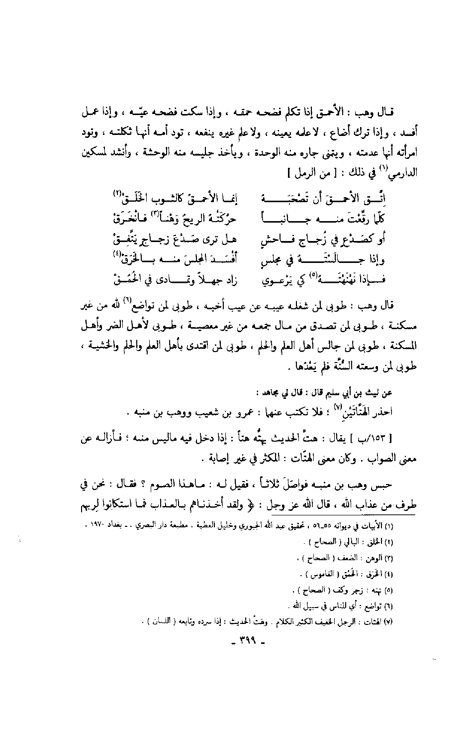 قال وهب: الأحمق إذا تكلم فضحه حمقه، وإذا سكت فضحه عيه، وإذا عمل أفسد، وإذا ترك أضاع، لا علمه يعينه، ولا علم غيره ينفعه، تود أمه أنها ثكلته، وتود امرأته أنها عدمته، ويتمنى جاره منه الوحدة، ويأخذ جليسه منه الوحشة، وأنشد لمسكين الدارمي في ذلك: من الرمل