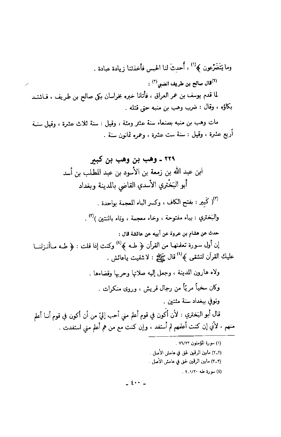 حدث عن هشام بن عروة عن أبيه عن عائشة قال: إن أول سورة تعلمتها من القرآن " طه " وكنت إذا قلت: " طه ما أنزلنا عليك القرآن لتشقى " قال صَلَّى اللهُ عَلَيْهِ وَسَلَّمَ: لا شقيت يا عائش.