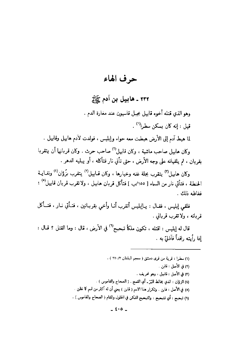 وكان هابيل صاحب ماشية، وكان قابيل صاحب حرث. وكان قربانهما أن يتقربا بقربان، ثم يلقيانه على وجه الأرض، حتى تأتي نار فتأكله، أو يبليه الدهر.