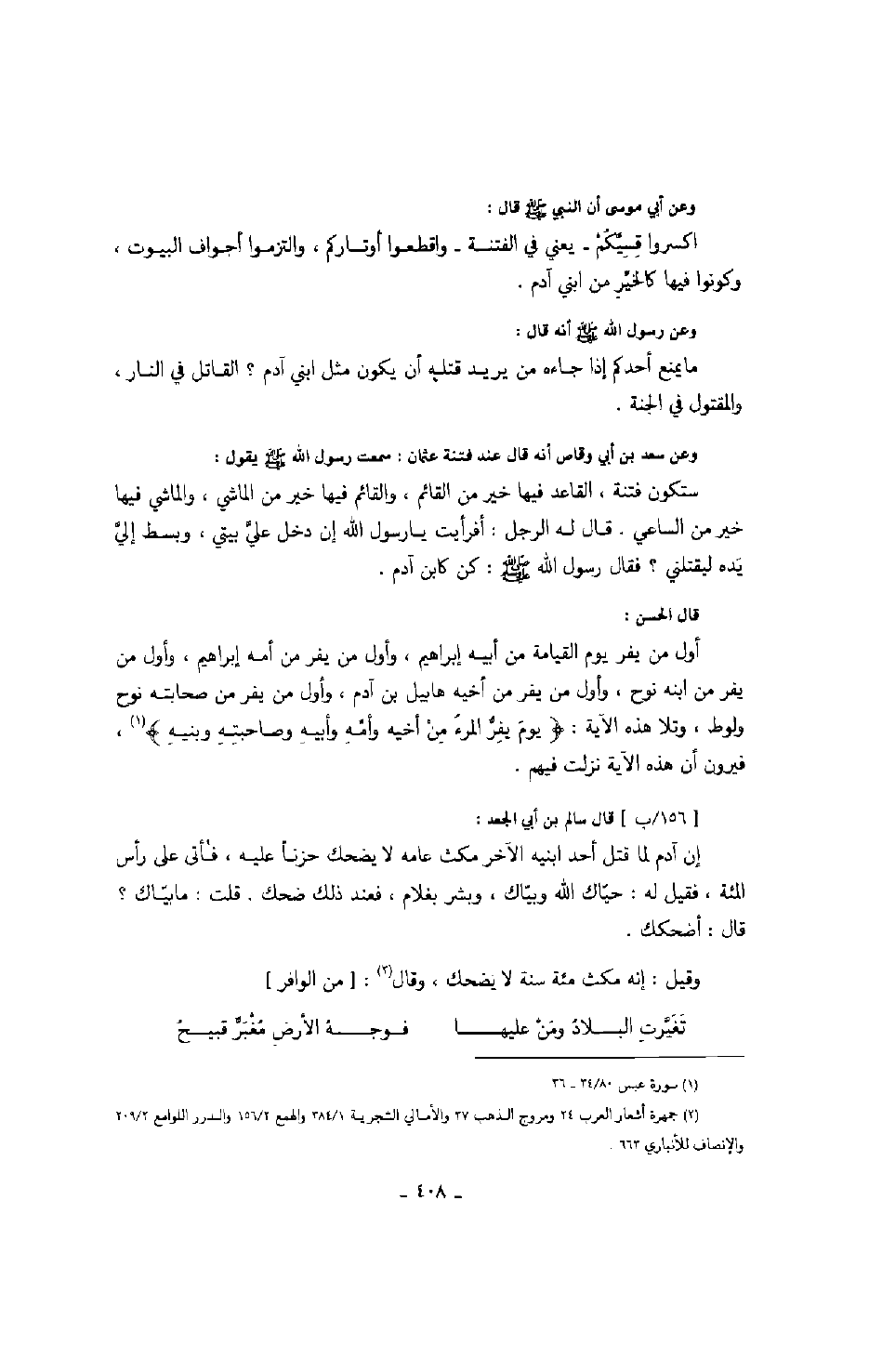 ستكون فتنة، القاعد فيها خير من القائم، والقائم فيها خير من الماشي، والماشي فيها خير من الساعي. قال له الرجل: أفرأيت يا رسول الله إن دخل علي بيتي، وبسط إلي يده ليقتلني؟ فقال رسول الله صَلَّى اللهُ عَلَيْهِ وَسَلَّمَ: كن كابن آدم.