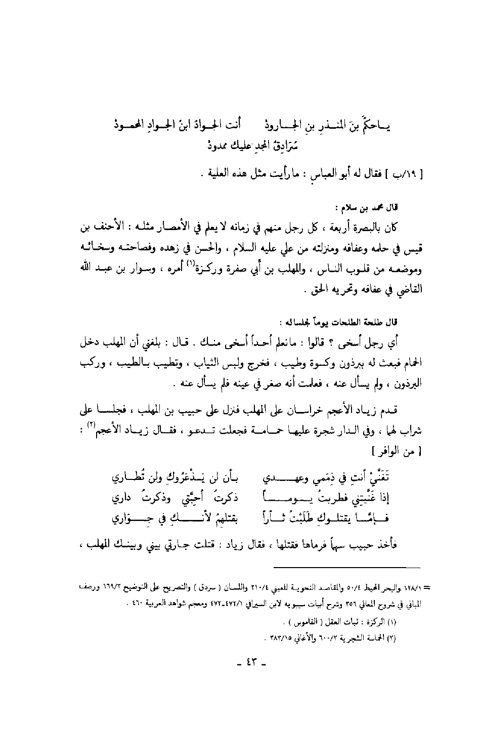 أي رجل أسخى؟ قالوا ما نعلم أحداً أسخى منك. قال: بلغني أن المهلب دخل الحمام فبعث له ببرذون وكسوة وطيب، فخرج ولبس الثياب، وتطيب بالطيب، وركب البرذون، ولم يسأل عنه، فعلمت أنه صغر في عينه فلم يسأل عنه.