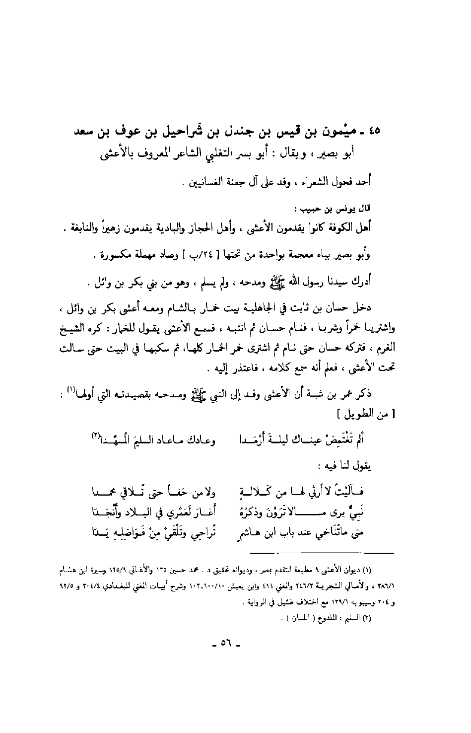 ذكر عمر بن شبة أن الأعشى وفد إلى النبي صَلَّى اللهُ عَلَيْهِ وَسَلَّمَ ومدحه بقصيدته التي أولها: " من الطويل "