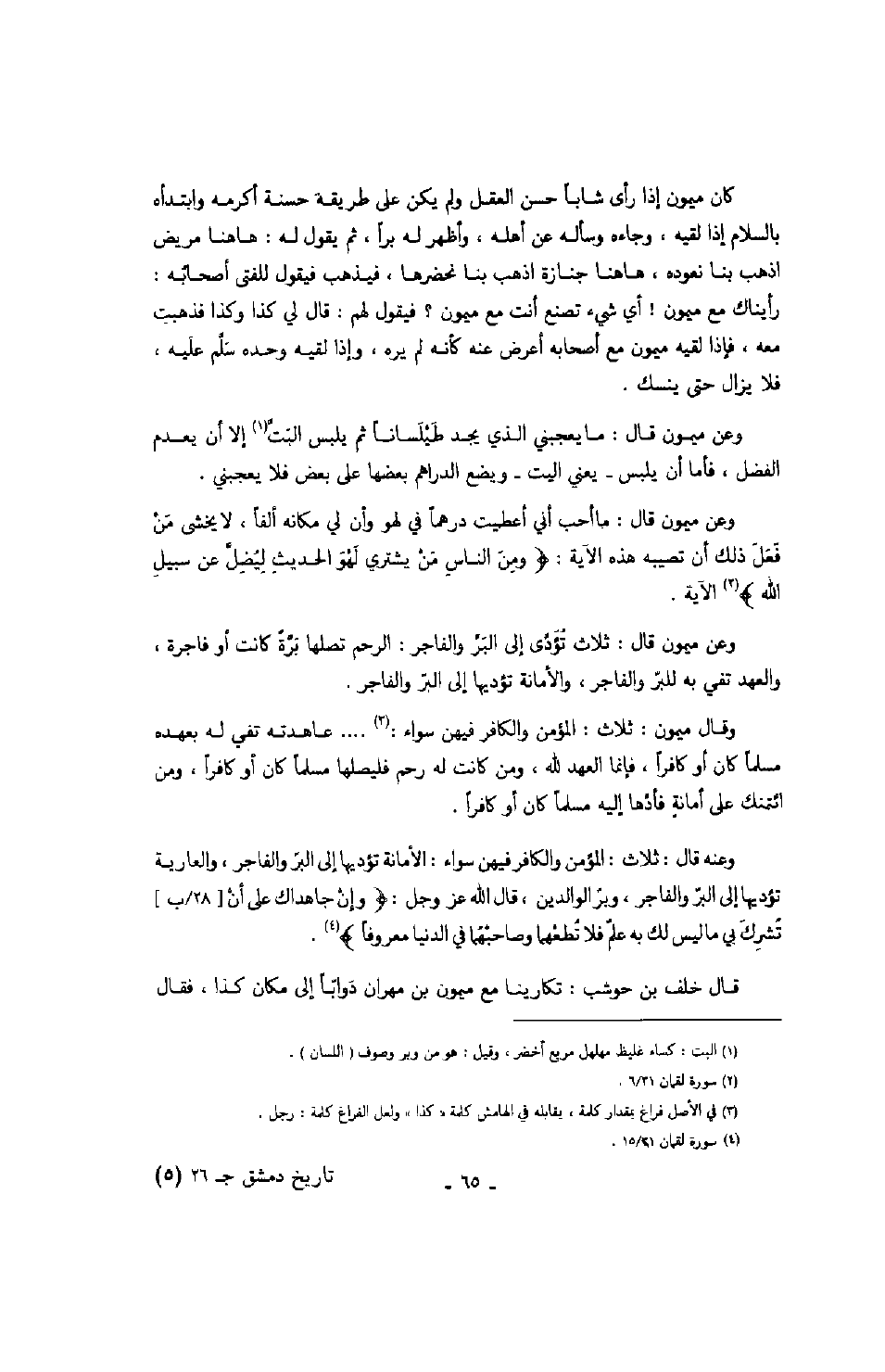 قال خلف بن حوشب: تكارينا مع ميمون بن مهران دواباً إلى مكان كذا، فقال