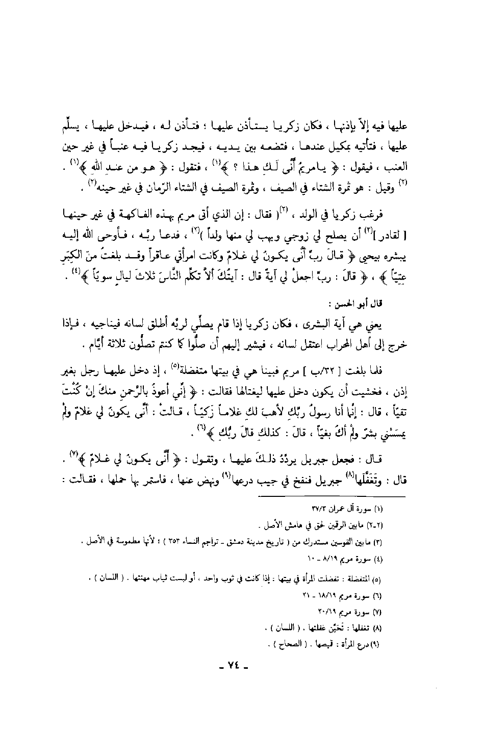 فلما بلغت مريم فبينا هي في بيتها متفضلة، إذ دخل عليها رجل بغير إذن، فخشيت أن يكون دخل عليها ليغتالها فقالت: " إني أعوذ بالرحمن منك إن كنت تقياً، قال: إنما أنا رسول ربك لأهب لك غلاماً زكياً، قالت: أنى يكون لي غلام ولم يمسسني بشر ولم أك بغياً، قال: كذلك قال ربك ".