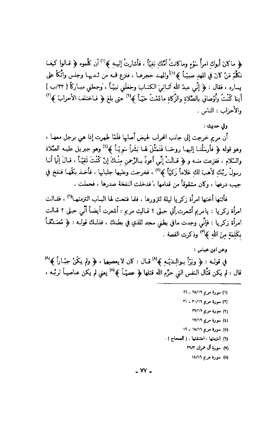 ما كان أبوك امرأ سوء وما كانت أمك بغياً، فأشارت إليه " أن كلموه " قالوا كيف نكلم من كان في المهد صبياً " والمهد حجرها، فنزع فمه من ثديها وجلس واتكأ على يساره، فقال: " إني عبد الله آتاني الكتاب وجعلني نبياً، وجعلني مباركاً أينما كنت وأوصاني بالصلاة والزكاة ما دمت حياً " حتى بلغ " فاختلف الأحزاب " والأحزاب: الناس.