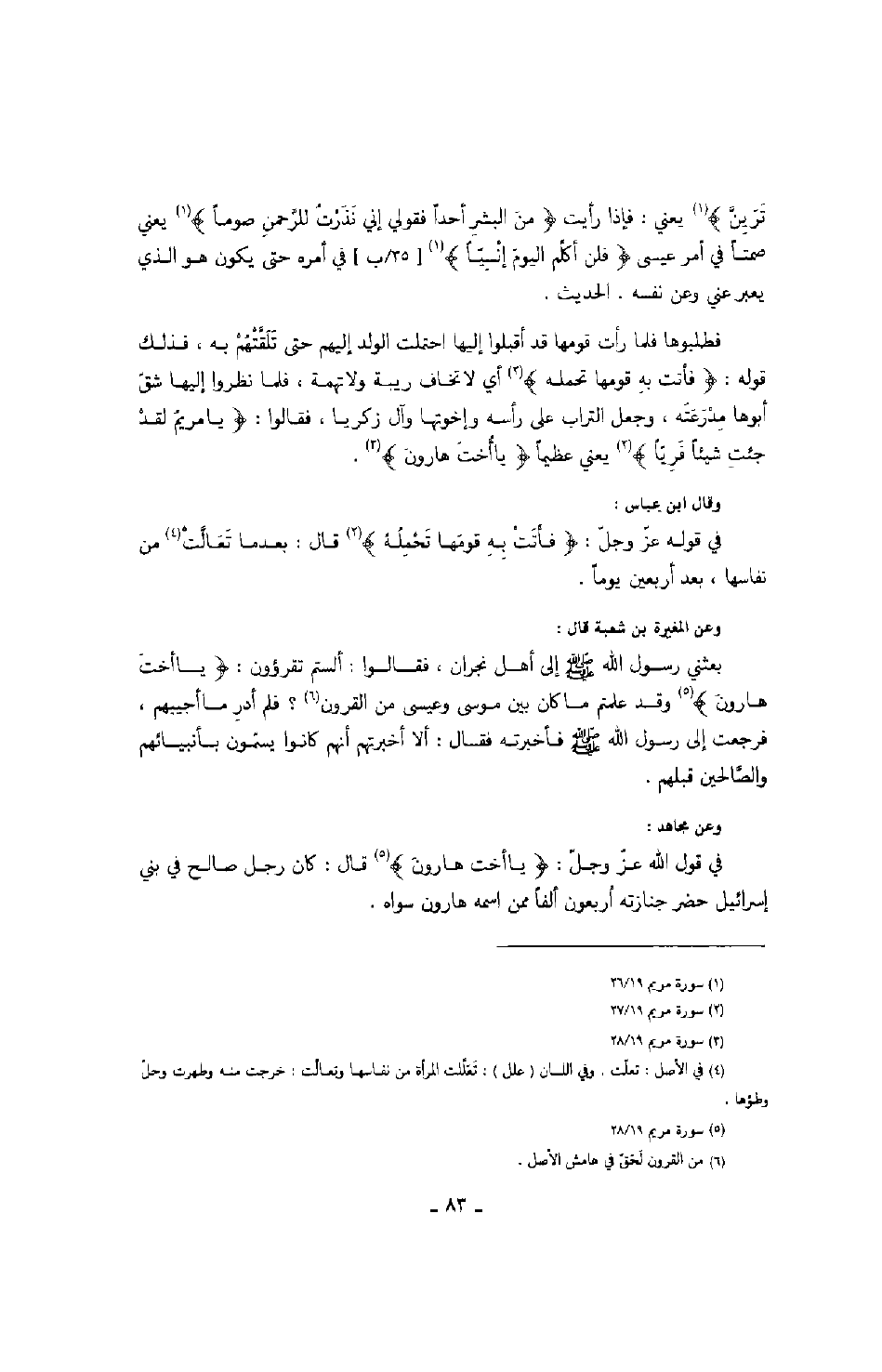 وعن مجاهد: في قول الله عز وجل: " يا أخت هارون " قال: كان رجل صالح في بني إسرائيل حضر جنازته أربعون ألفاً ممن اسمه هارون سواه.