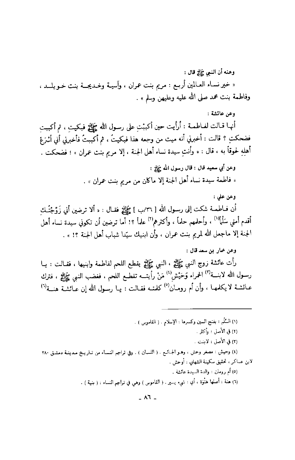 وعن عمار بن سعد قال: رأت عائشة زوج النبي صَلَّى اللهُ عَلَيْهِ وَسَلَّمَ، النبي صَلَّى اللهُ عَلَيْهِ وَسَلَّمَ يقطع اللحم لفاطمة وابنيها، فقالت: يا رسول الله لابنة الحمراء وحيش من رأيته تقطع اللحم، فغضب النبي صَلَّى اللهُ عَلَيْهِ وَسَلَّمَ، فترك عائشة لا يكلمها، وأن أم رومان كلمته فقالت: يا رسول الله إن عائشة هنة