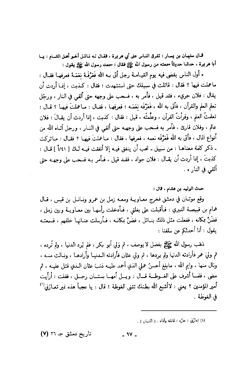 قال سليمان بن يسار: تفرق الناس على أبي هريرة، فقال له ناتل أخو أهل الشام: يا أبا هريرة، حدثنا حديثاً سمعته من رسول الله صَلَّى اللهُ عَلَيْهِ وَسَلَّمَ فقال: سمعت رسول الله صَلَّى اللهُ عَلَيْهِ وَسَلَّمَ يقول: " أول الناس يقضى فيه يوم القيامة رجل أتى به الله فعرفه نعمه فعرفها فقال: ما عملت فيها؟ فقال: قاتلت في سبيلك حتى استشهدت؛ فقال: كذبت، إنما أردت أن يقال: فلان جريء، فقد قيل، فأمر به، فسحت على وجهه حتى ألقي في النار، ورجل تعلم العلم والقرآن، فأتى به الله، فعرفه نعمه؛ فعرفها، فقال: ما عملت فيها؟ قال: تعلمت العلم، وقرأت القرآن، وعلمته، قيل: فقال: كذبت، إنما أردت أن يقال: فلان عالم، وفلان قارئ، فأمر به فسحب على وجهه حتى ألقي في النار، ورجل آتاه الله من أنواع المال، فأتى به الله فعرفه نعمه، فعرفها، فقال: ما عملت فيها؟ فقال: ما تركت - ذكر كلمة معناها: من سبيل - تحب أن ينفق فيه إلا أنفقه فيه لك قال: كذبت، إنما أردت أن يقال: فلان جواد، فقد قيل، فأمر به فسحب على وجهه حتى ألقي في النار ".