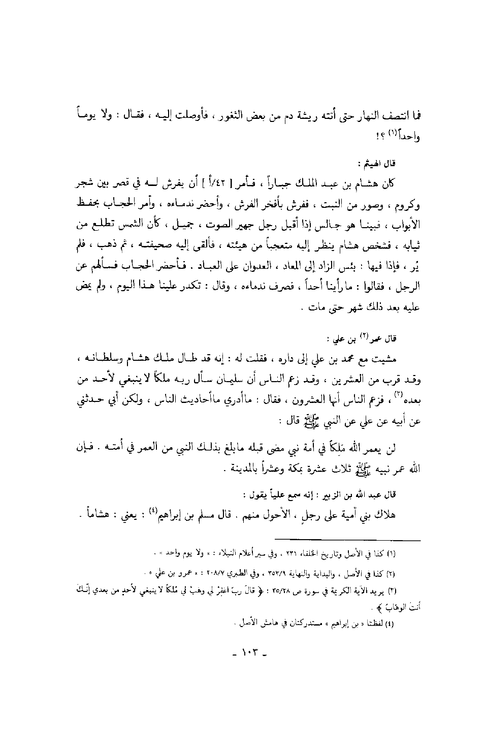 قال عبد الله بن الزبير: إنه سمع علياً يقول: هلاك بني أمية على رجل، الأحول منهم. قال مسلم بن إبراهيم: يعني: هشاماً.