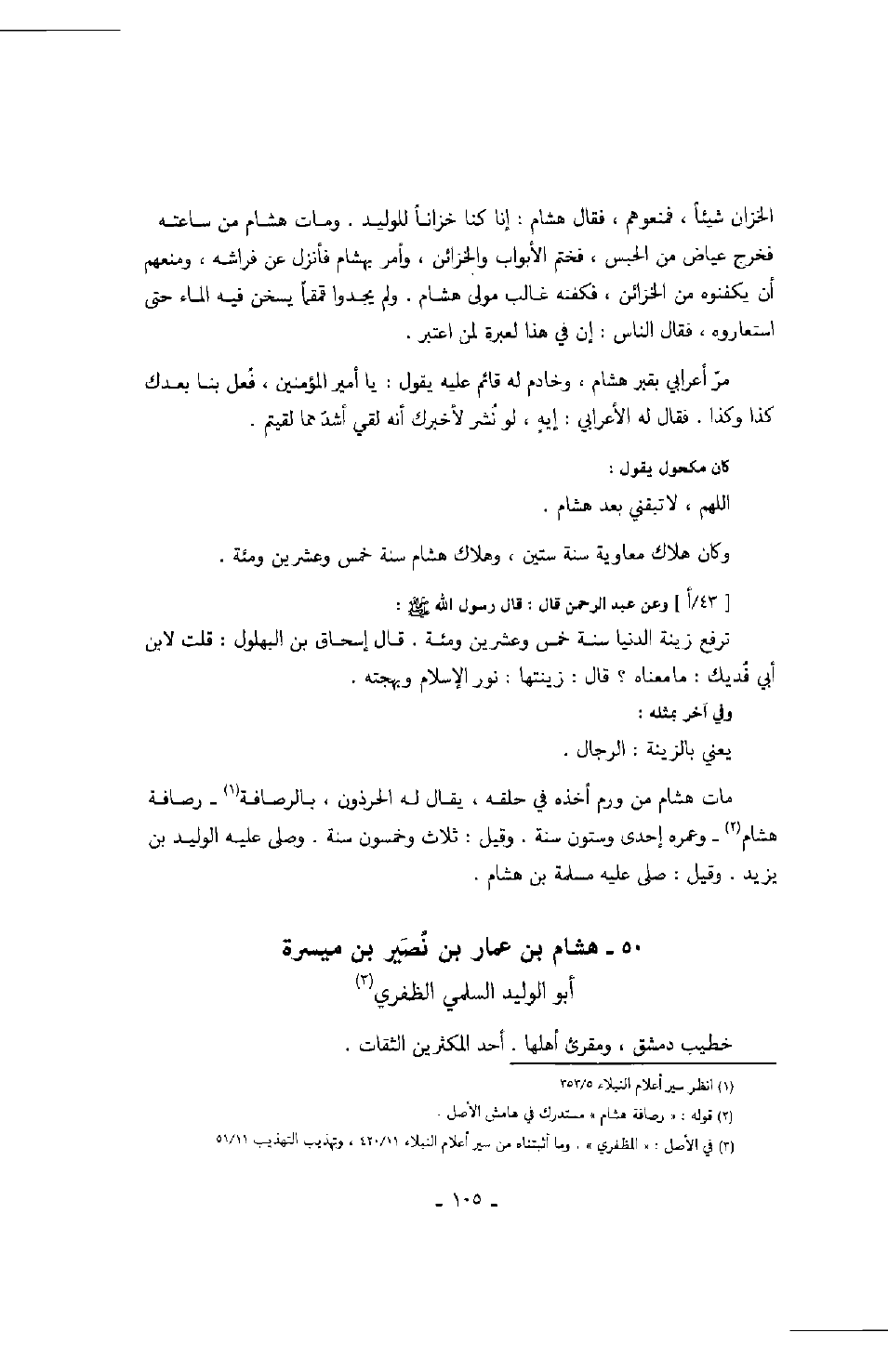 الخزان شيئاً، فمنعوهم، فقال هشام: إنا كنا خزاناً للوليد. ومات هشام من ساعته فخرج عياض من الحبس، فختم الأبواب والخزائن، وأمر بهشام فأنزل عن فراشه، ومنعهم أن يكفنوه من الخزائن، فكفنه غالب مولى هشام. ولم يجدوا قمقماً يسخن فيه الماء حتى استعاروه، فقال الناس: إن في هذا لعبرة لمن اعتبر.