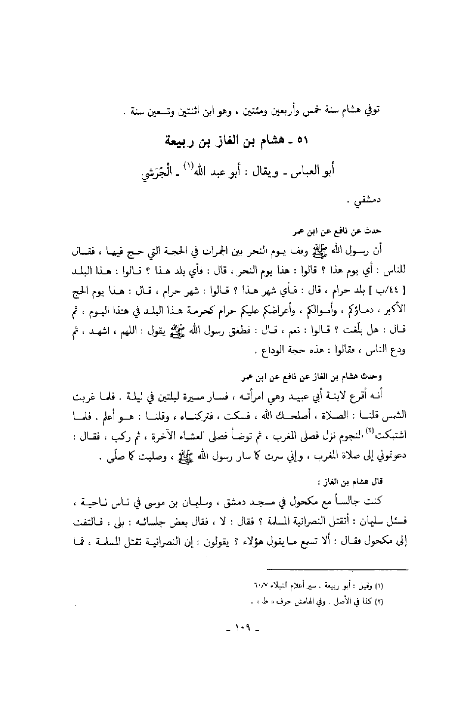حدث عن نافع ابن عمر، أن رسول الله صَلَّى اللهُ عَلَيْهِ وَسَلَّمَ وقف يوم النحر بين الجمرات في الحجة التي حج فيها، فقال للناس: أي يوم هذا؟ قالوا: هذا يوم النحر، قال: فأي بلد هذا؟ قالوا: هذا البلد بلد حرام، قال: فأي شهر هذا؟ قالوا: شهر حرام، قال: هذا يوم الحج الأكبر، دماؤكم، وأموالكم، وأعراضكم عليكم حرام كحرمة هذا البلد في هذا اليوم، ثم قال: هل بلغت؟ قالوا: نعم، قال: فطفق رسول الله صَلَّى اللهُ عَلَيْهِ وَسَلَّمَ يقول: اللهم، اشهد، ثم ودع الناس، فقالوا: هذه حجة الوداع.