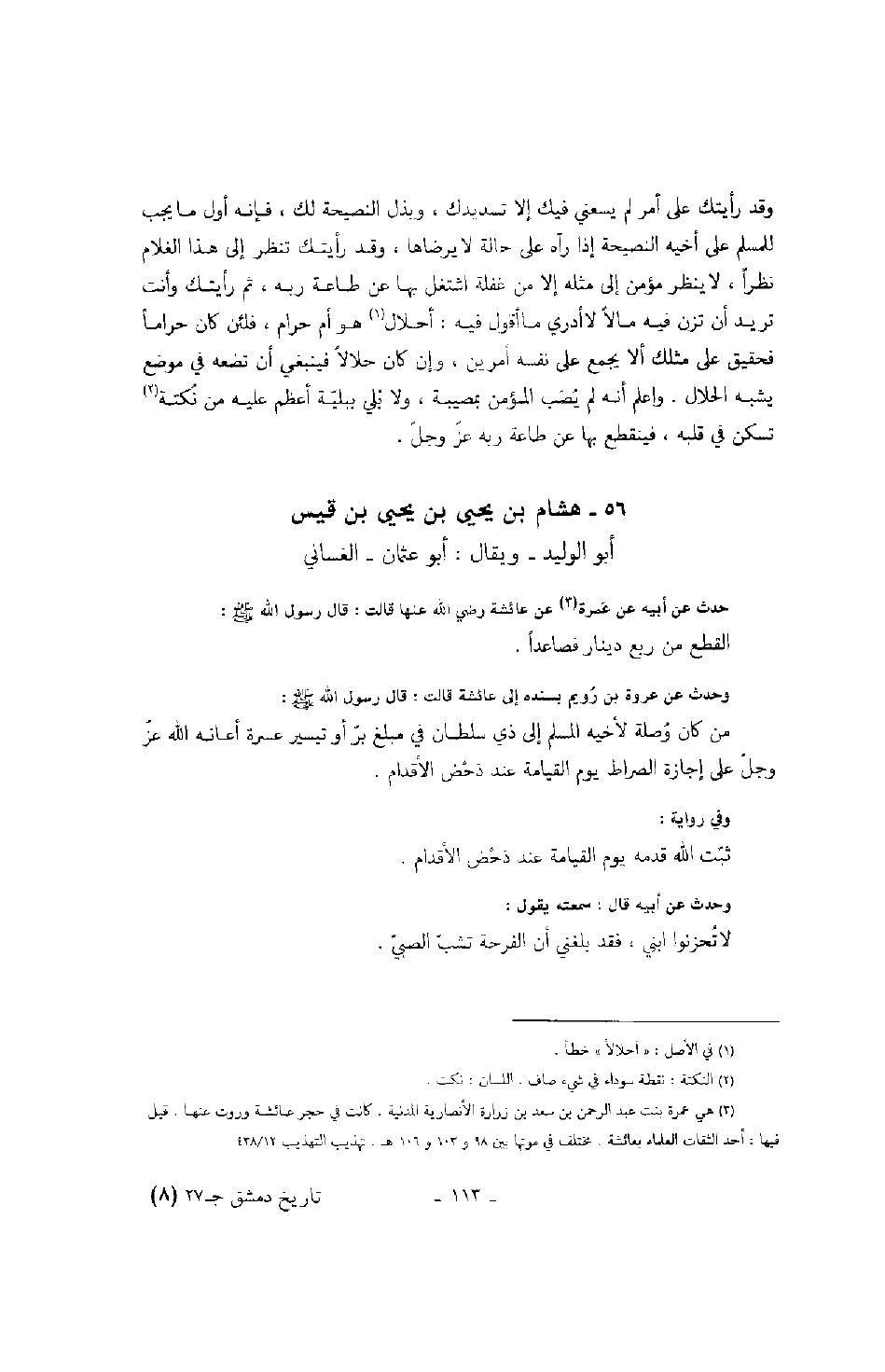 وحدث عن عروة بن رويم بسنده إلى عائشة قالت: قال رسول الله صَلَّى اللهُ عَلَيْهِ وَسَلَّمَ: من كان وصلةً لأخيه المسلم إلى ذي سلطان في مبلغ بر أو تيسير عسرة أعانه الله عز وجل على إجازة الصراط يوم القيامة عند دحض الأقدام.
